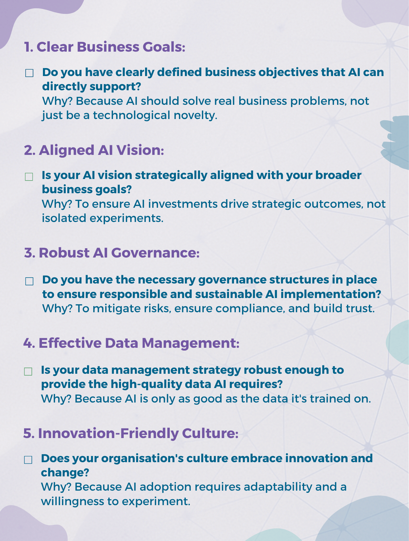 Before embarking on AI, it’s crucial to honestly evaluate your organisation’s preparedness. Here’s a checklist to gauge your readiness: