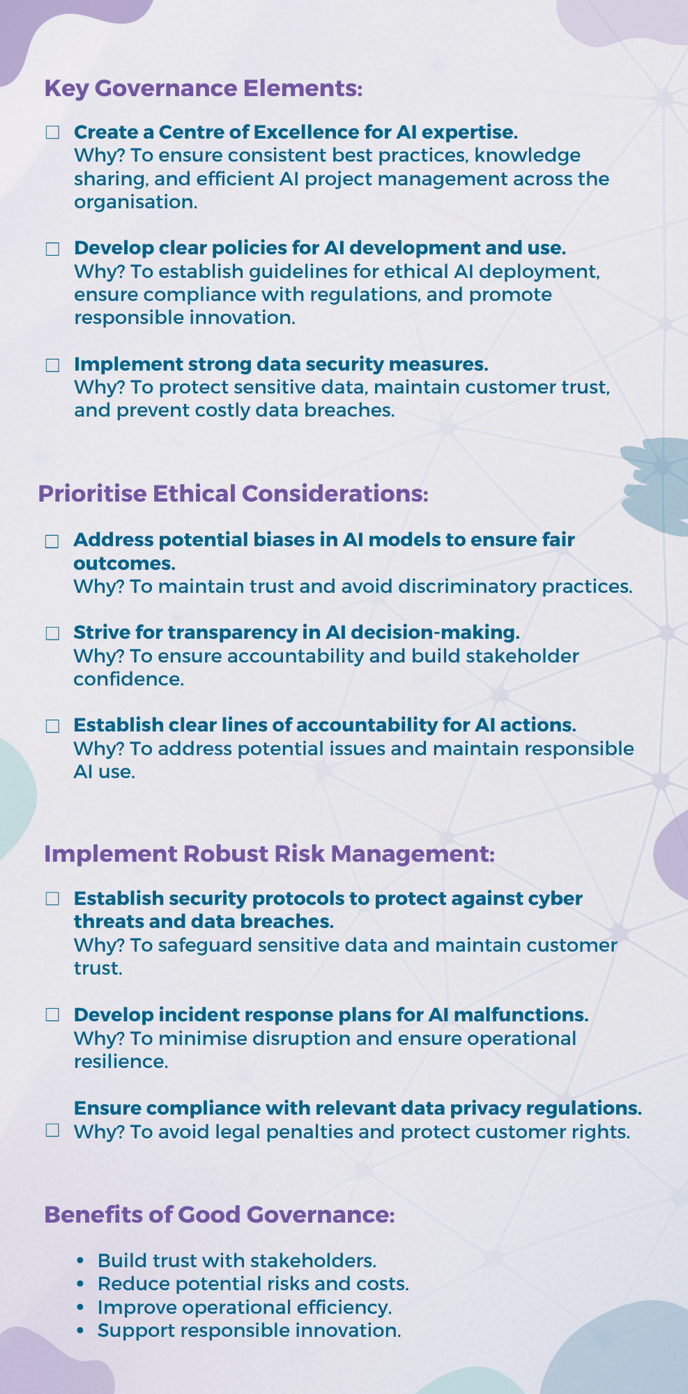 In summary, effective AI governance provides the framework for responsible and successful AI implementation, ensuring it serves your organisation’s needs while upholding ethical standards.